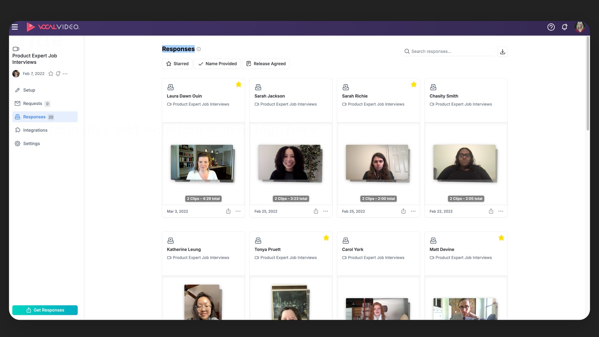Each video response that you choose to publish is assigned its own branded public page hosted on the Vocal Video platform with an automatically-generated share link to access it. The Vocal Video branded pages are completely ad-free and you can restrict viewing to a specific audience. It is also possible to upload the videos to third-party video hosting platforms like YouTube or Vimeo.