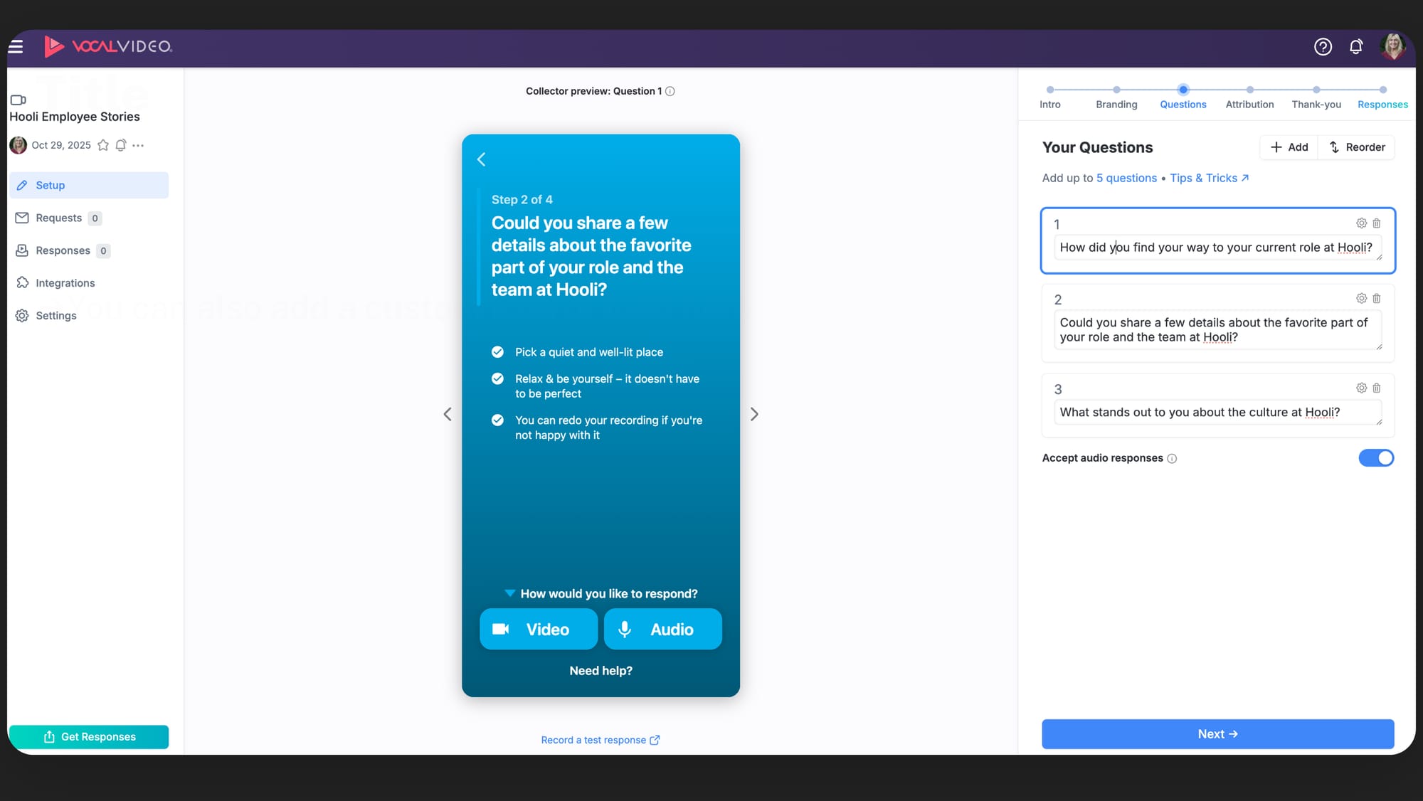 The Vocal Video collector is the interface that guides your respondents through the process. It records the video and automatically adds your brand assets to the finished product.