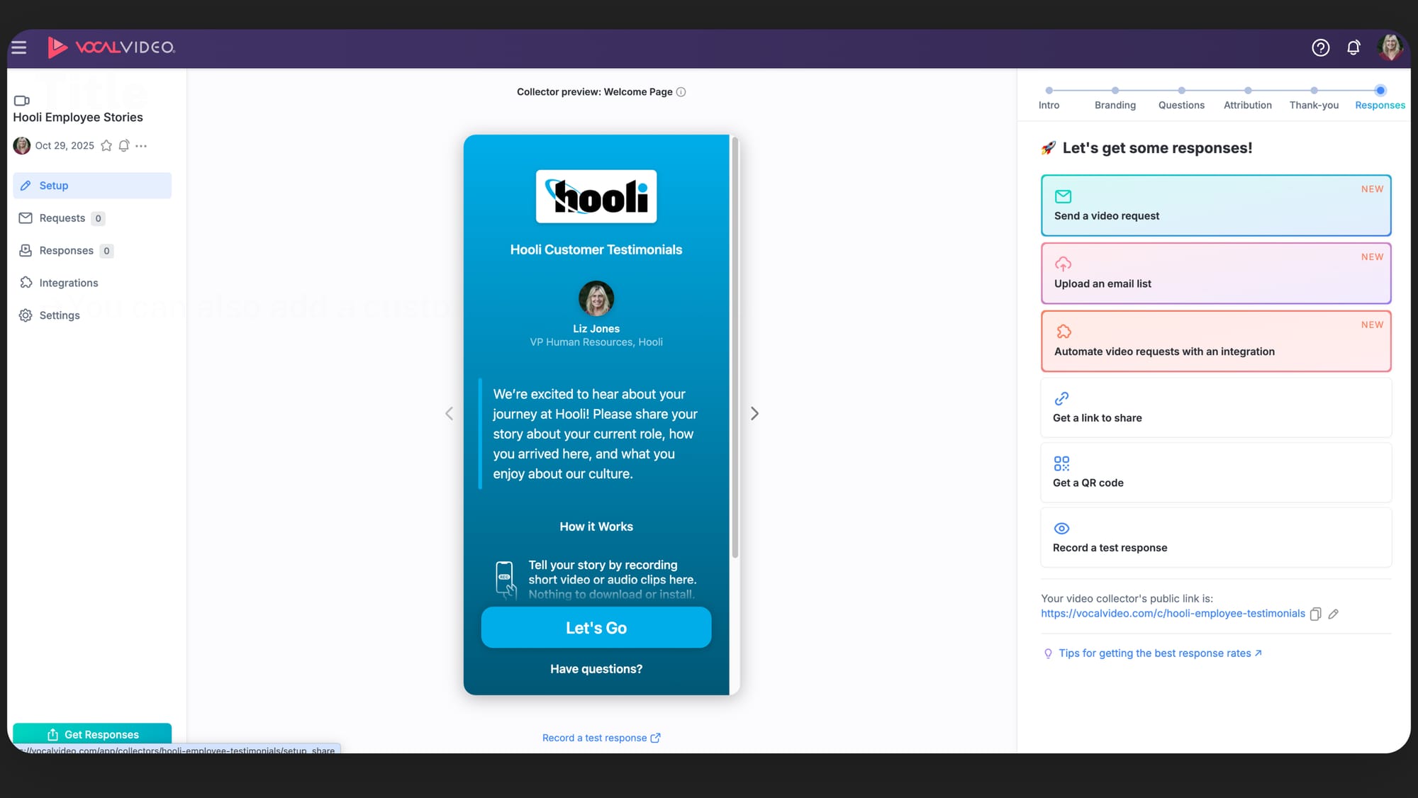 Vocal Video collectors are shared with a URL. Click on "Responses" to see the various options for distributing the link (including sending email from your Vocal Video account, sharing the link yourself via email, text or your social media accounts, or automating requests with an integration).