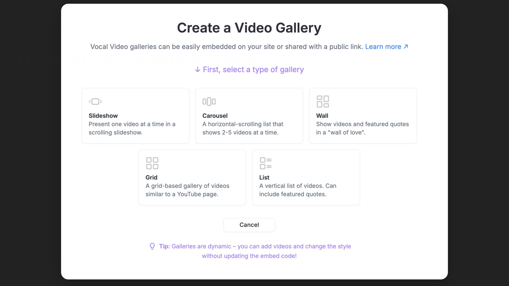 To create a gallery in Vocal Video, click “Galleries” > “Create a Gallery” > and choose from five different formats to suit the layout of your website.