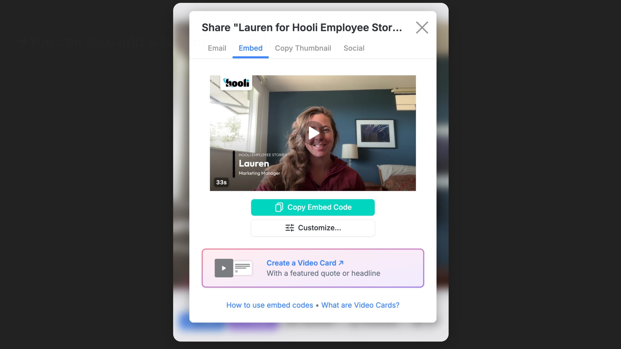 If you’d rather embed video testimonials on your website, we’ll automatically generate the code you need. Simply confirm how you’d like your embedded video or video testimonial card to look, copy the code, and paste it into a new HTML block of your website.