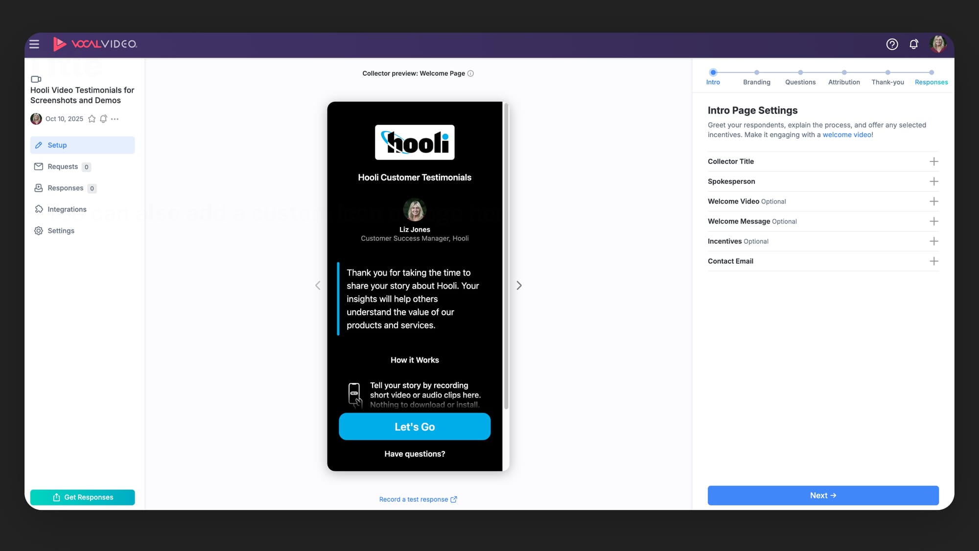 Vocal Video's recording process is designed to simplify the process of creating a testimonial by reducing the usual technical hurdles of recording and editing video. The step-by-step process makes it much easier by getting your employees to answer between three and five pre-set questions, and allowing them to record their answers in a few clicks.