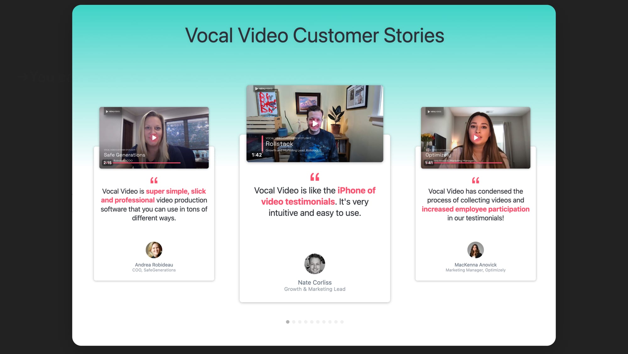 Vocal Video also offers a user-friendly video gallery tool which lets you present your videos in an attractive manner. This includes options such as walls of love, grids, cards, sliders, carousels (pictured below), and more.