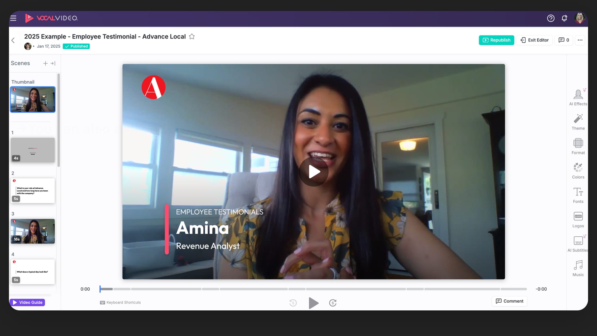 With Vocal Video's intuitive editing tools, you can have full control over your employee success story videos without needing to export them into any third-party software — although if you would like to, that option is also available.