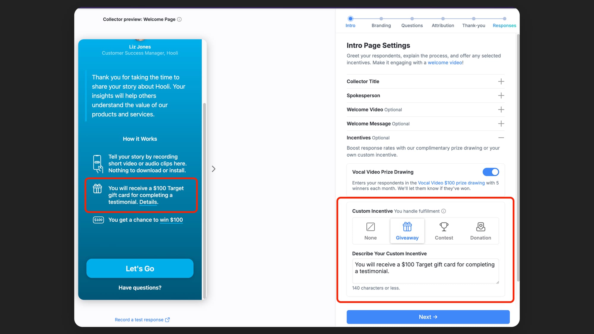 For example, if you use Vocal Video to collect testimonials, we’ve included options for giveaways, contests, or donations to make it easy to encourage your customers to participate.