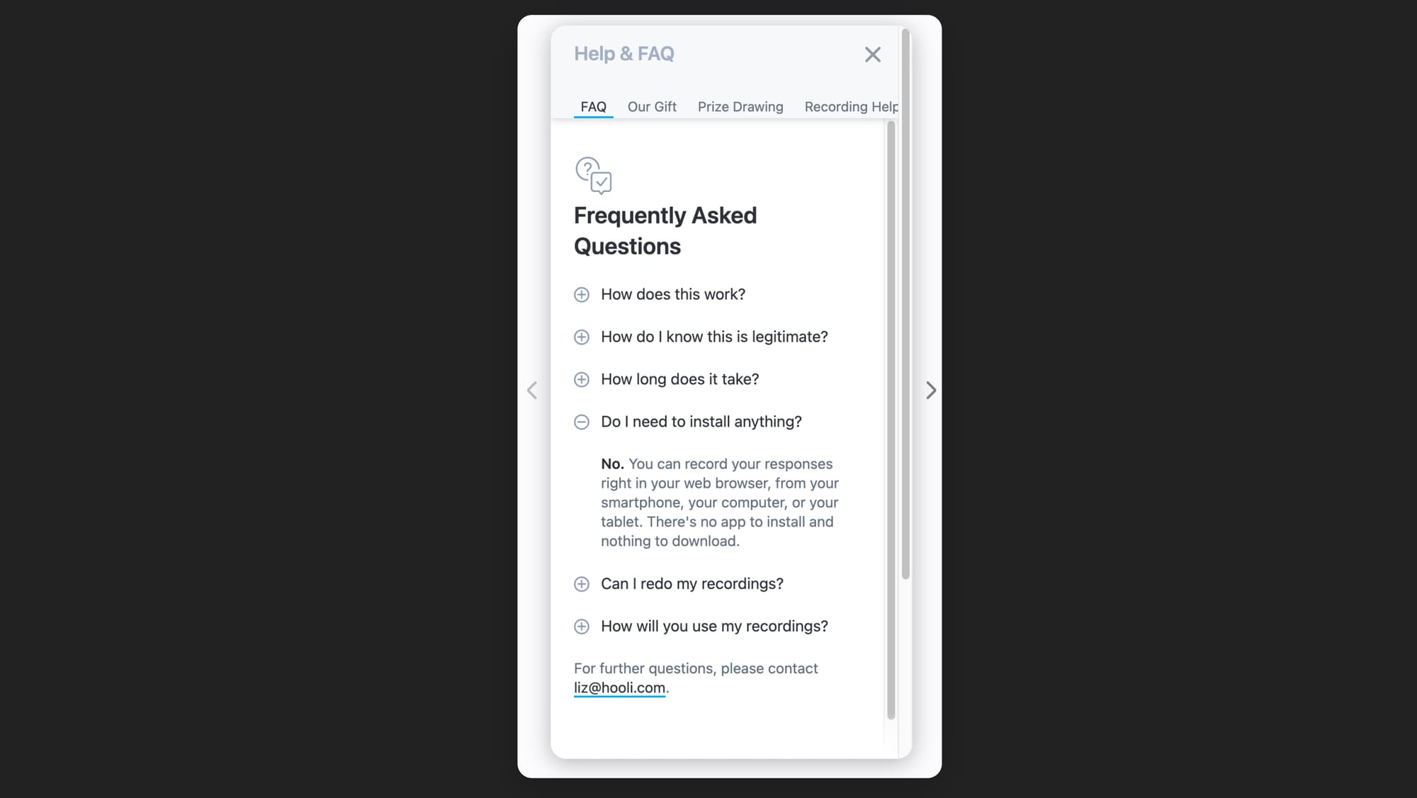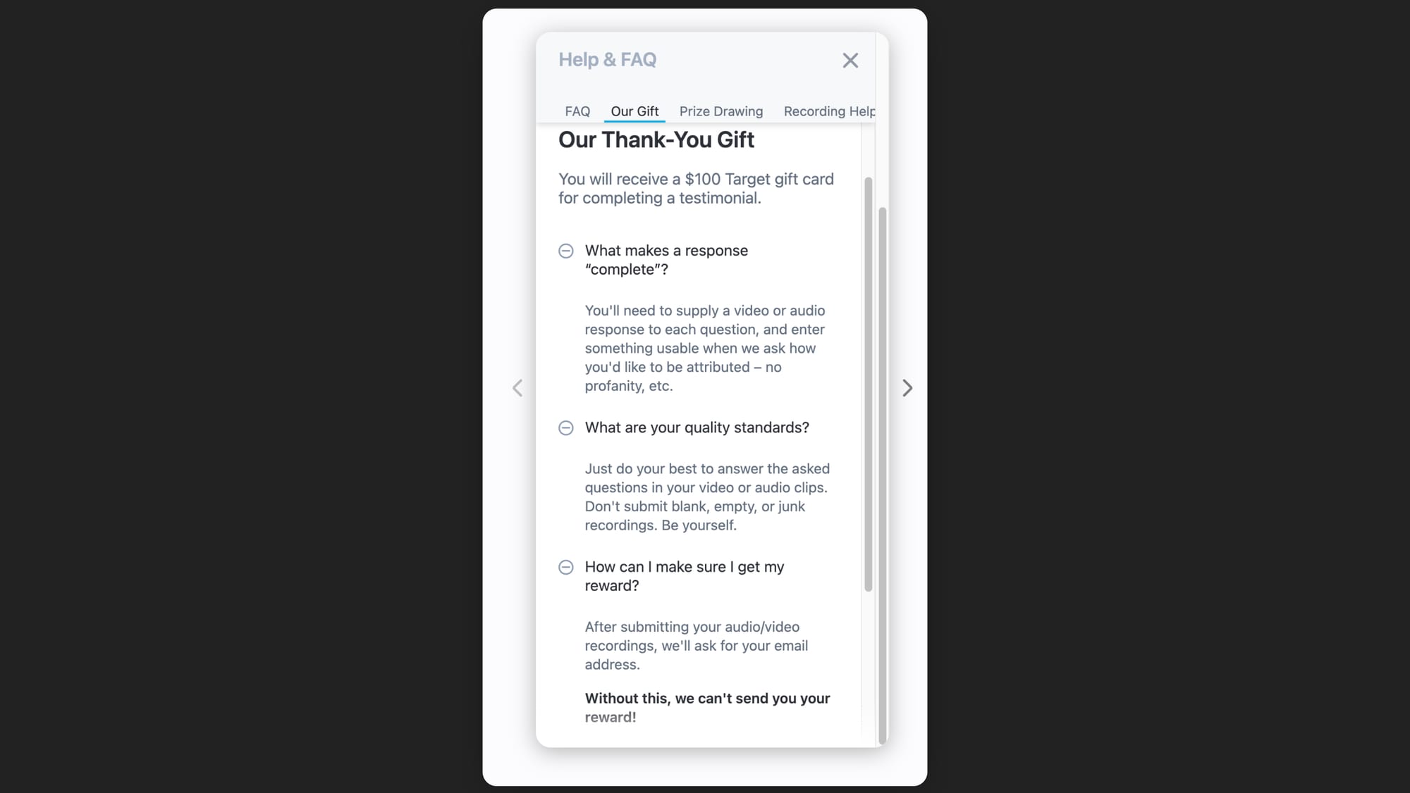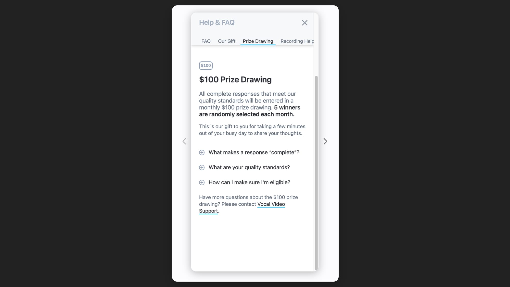 Vocal Video can automatically include your respondents in their monthly prize drawing for $100, which is given to five random participants across their platform.