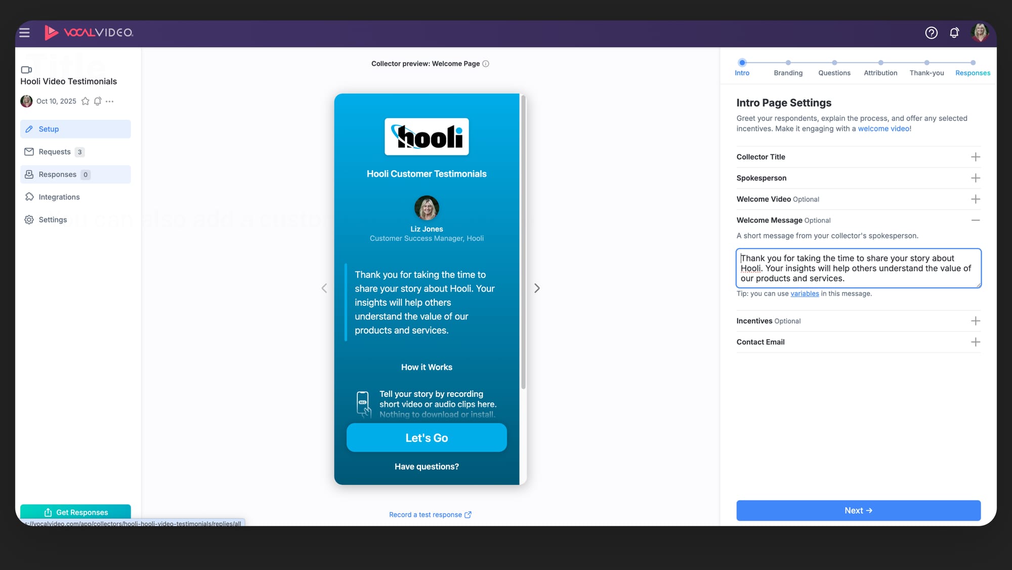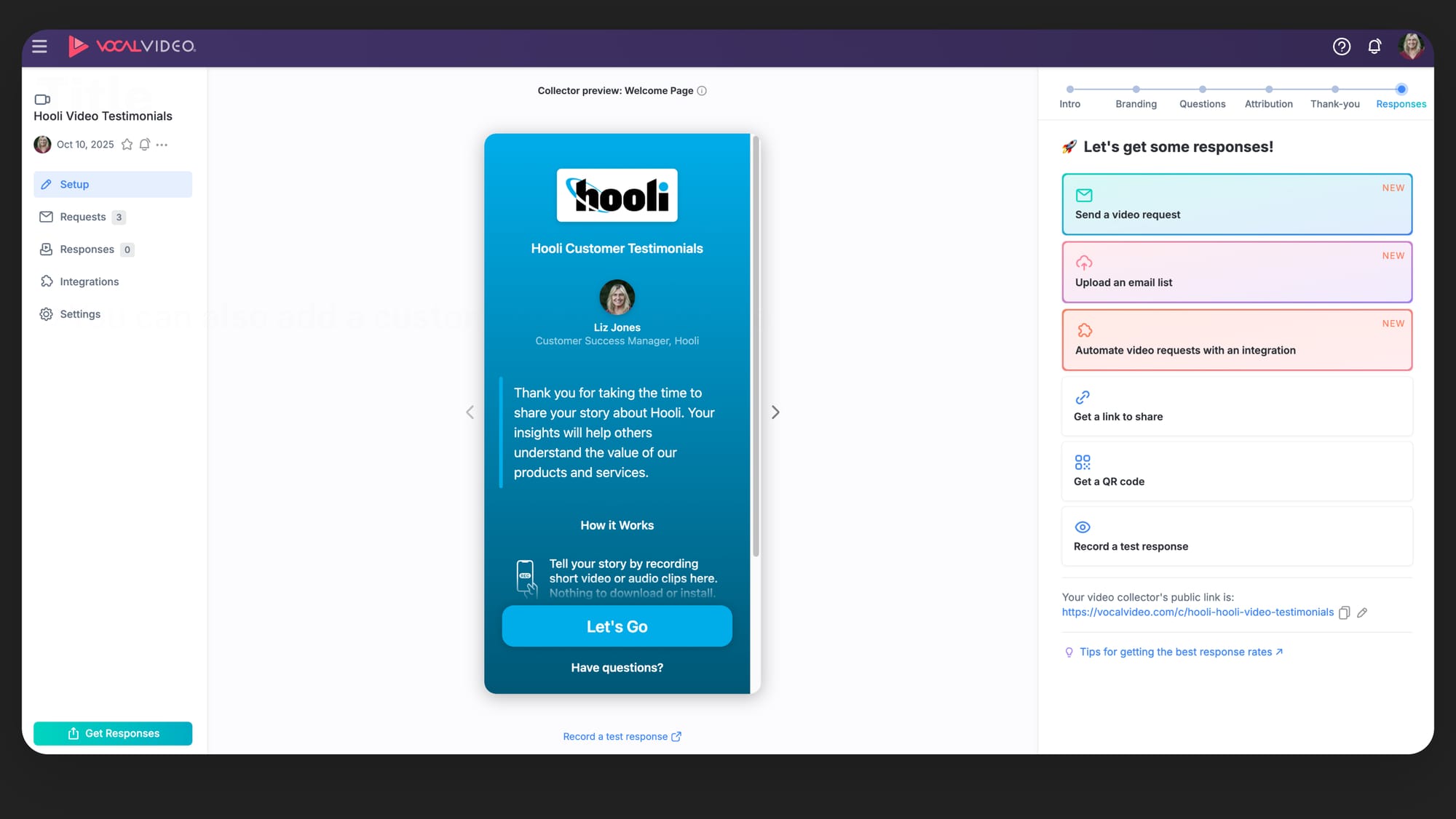 The link takes customers to the Vocal Video “collector” — which includes a series of landing pages that guide the customer through the video testimonial recording process.