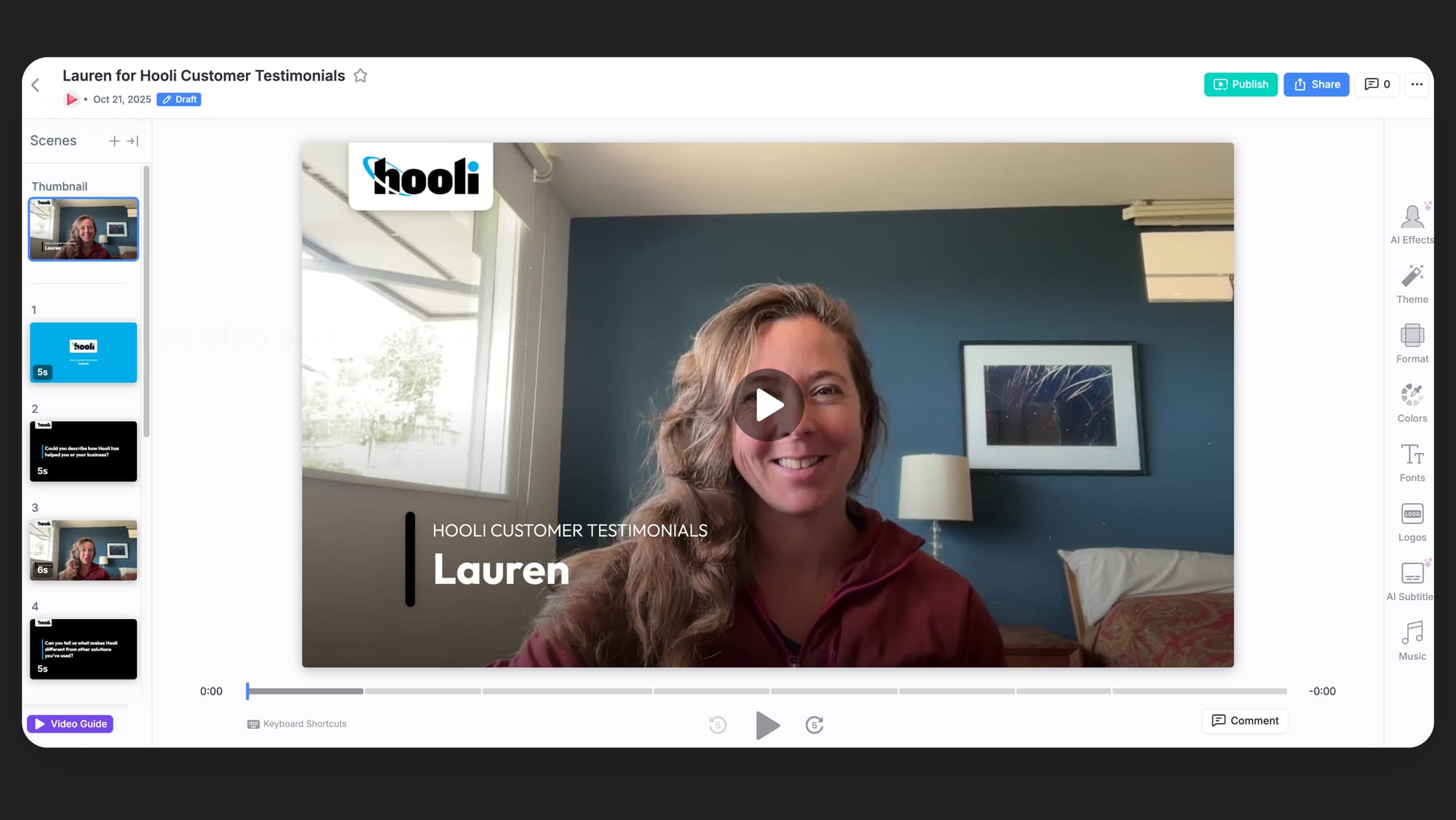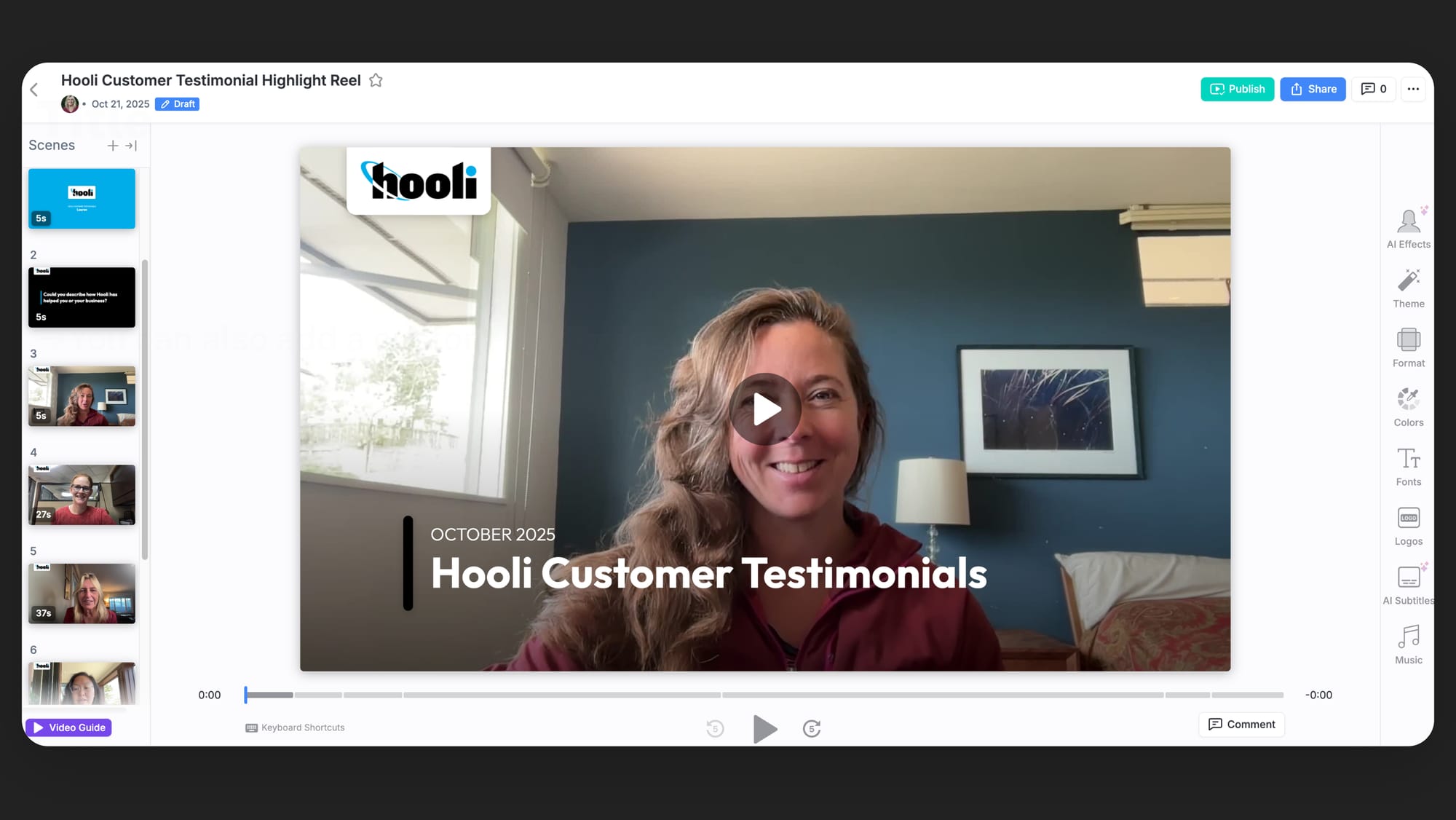 You can edit the colors or content of any visual element as well, and even trim clips and create video montages with multiple clips of satisfied customers.