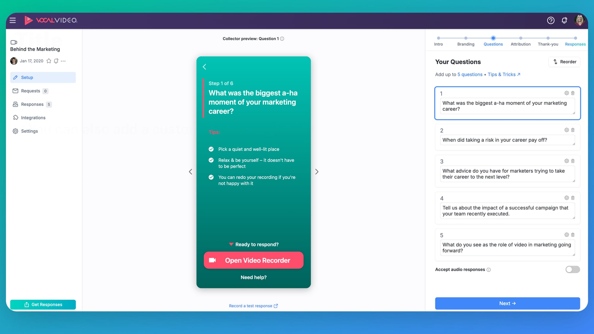 - Step one: In the Vocal Video app, you create a video collector with the questions that you want to ask your interviewees.