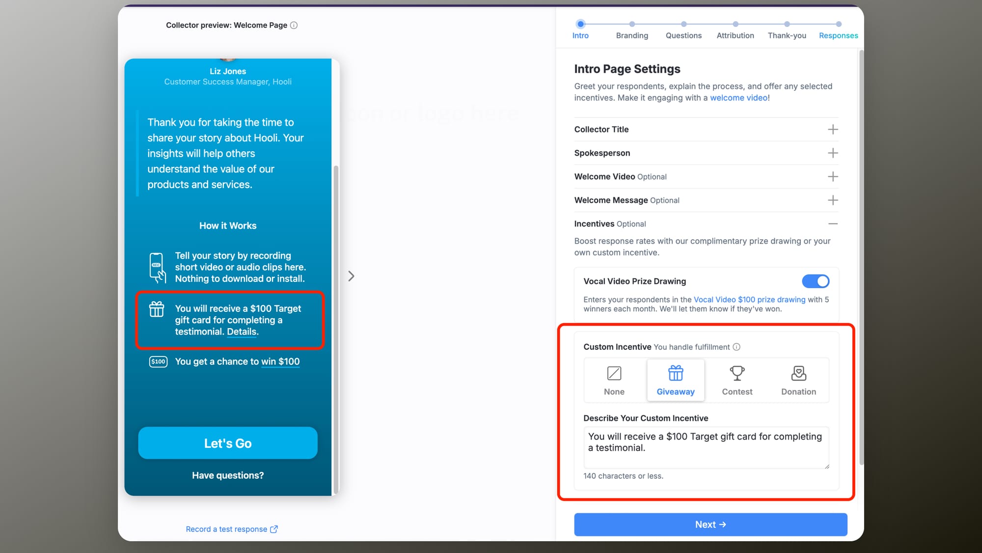 You simply make the changes you want to your chosen template, add your own brand colors and logo, and include an optional incentive for reviewers who record a video (we offer a monthly cash prize draw, or you can choose to add your own custom incentive).