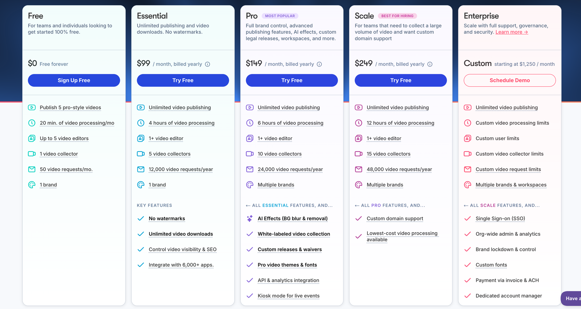 - Scale Plan for teams that need to collect a large volume of video (best for hiring): $249/month, billed annually