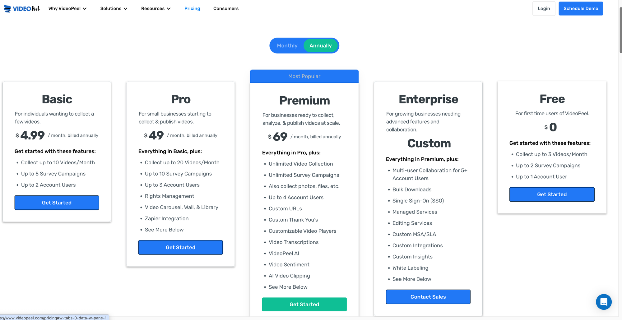 VideoPeel offers a free plan for first time users of VideoPeel, after which they have 3 main plans along with custom enterprise pricing: