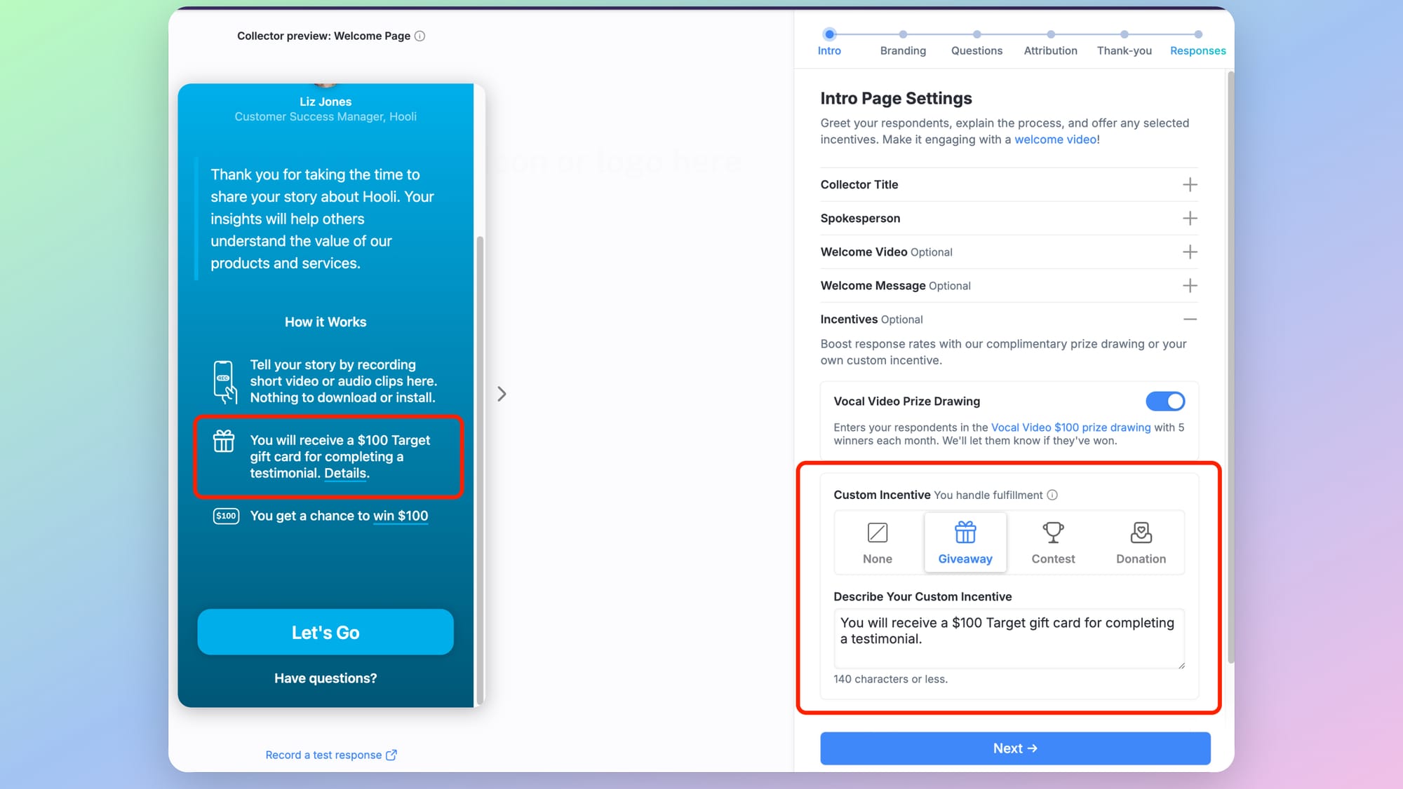 Respondents can also take part in the Vocal Video company-wide $100 monthly drawing, managed and funded by Vocal Video, and given away to 5 participants each month. (You have the option to turn on or off the option to include your participants in Vocal Videos monthly giveaway.)
