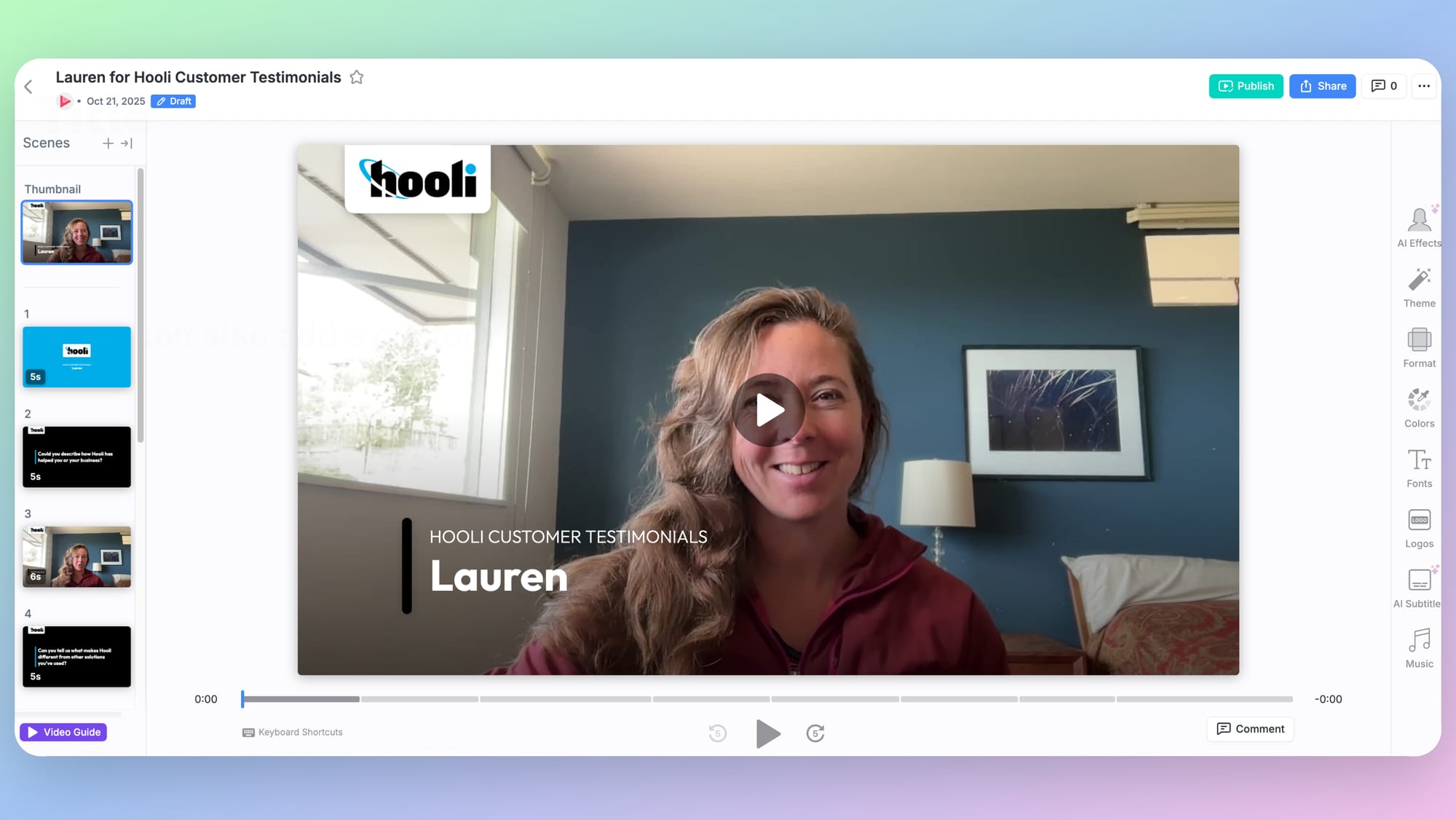 Afterward, Vocal Video automagically applies features such as title cards, question cards, music, branding, logos, subtitles, the participant’s basic information, and a CTA — before you even open the editing tool.