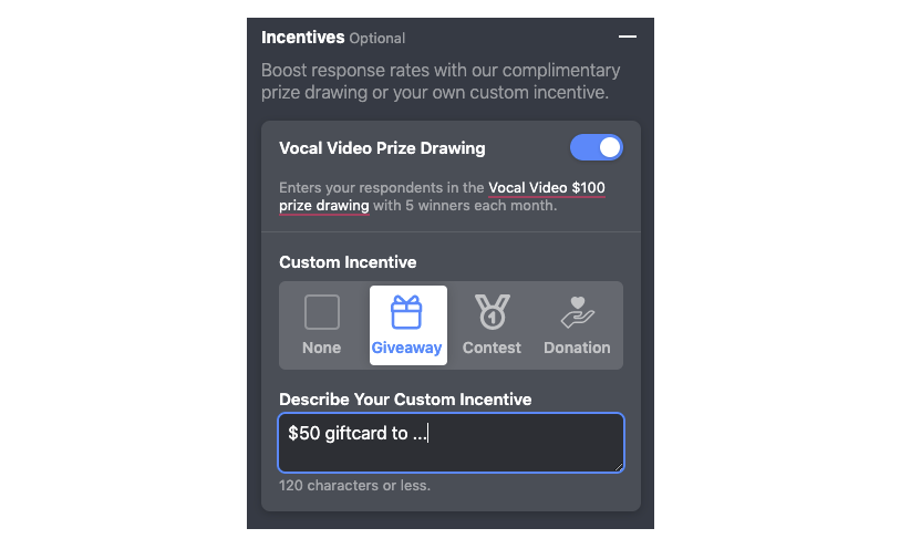 Respondents can also take part in the Vocal Video company-wide $100 monthly drawing, managed and funded by Vocal Video, and given away to 5 participants each month. (You have the option to turn on or off the option to include your participants in Vocal Videos monthly giveaway.)