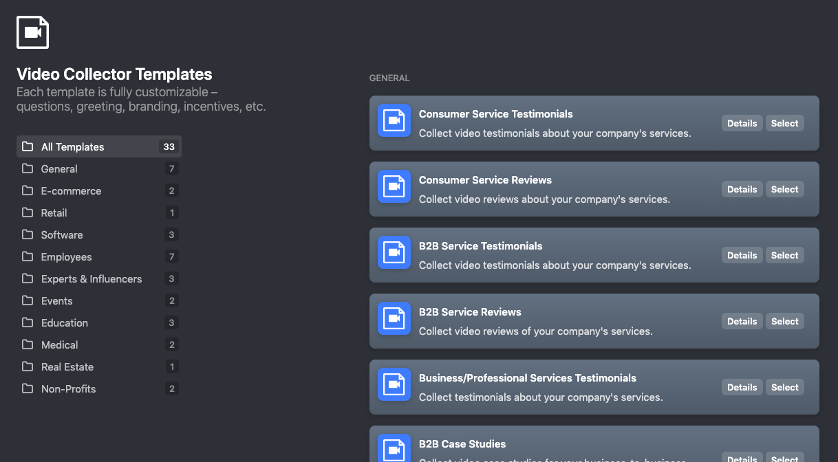 They’re organized based on what kind of testimonial you want to create, making finding the right one simple and easy.