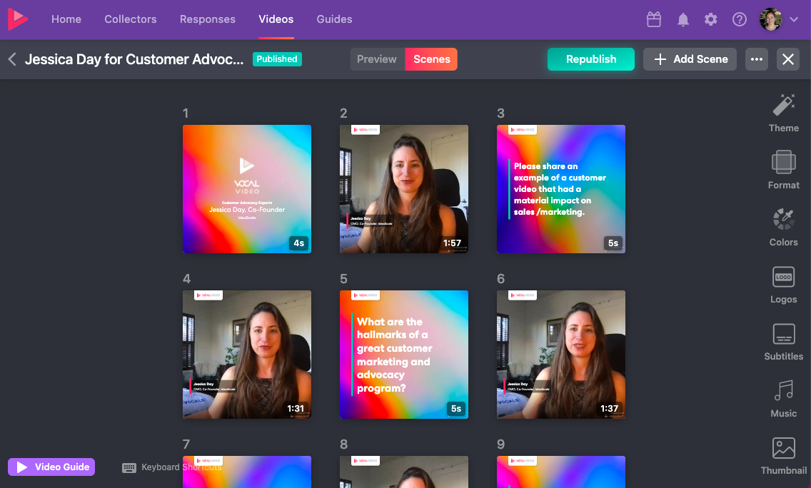 Afterward, Vocal Video automagically applies features such as title cards, question cards, music, branding, logos, subtitles, the participant’s basic information, and a CTA — before you even open the editing tool.