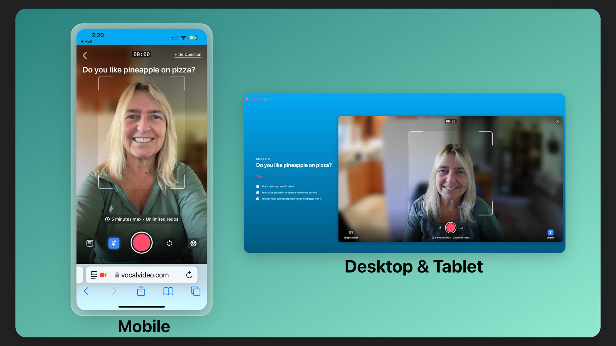 The user doesn’t have to download anything; they just click the link you send and your Vocal Video landing page opens up in their browser. This encourages responses from participants by making the experience as frictionless as possible, without any downloads required.