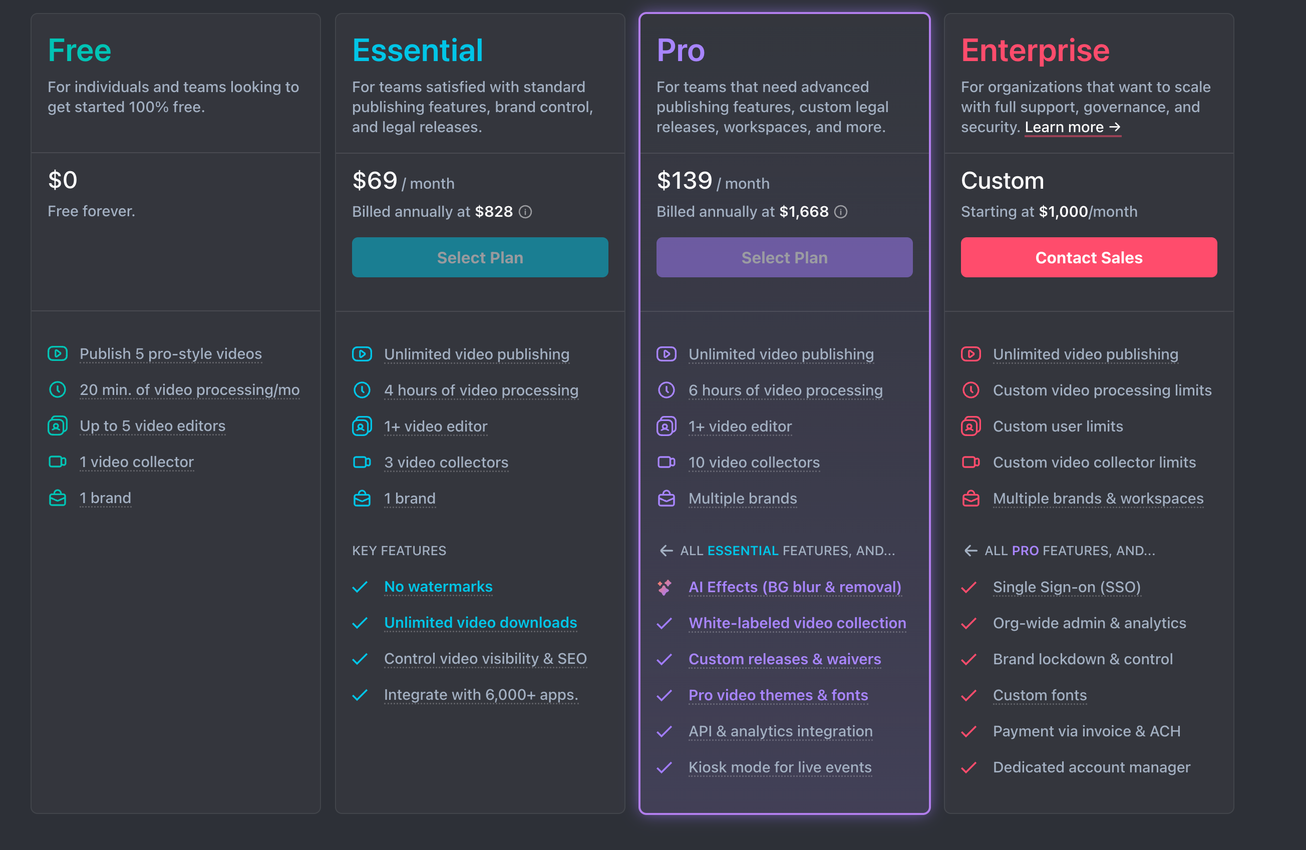 Their Pro plan, advertised as best for small businesses, ranges from $49-$69 per month (paying annually will save you money). It comes with unlimited videos, but you can only have one user on the account. You also can’t add your own branding, use custom URLs, or get onboarding support.